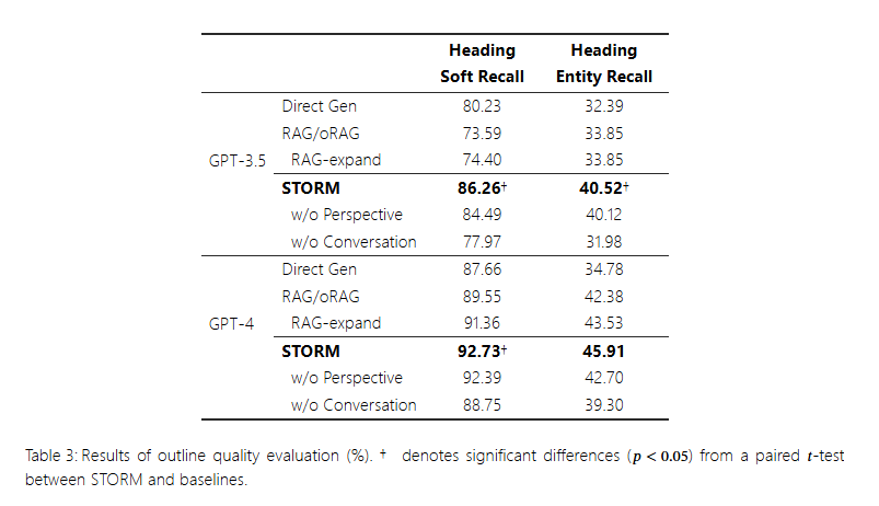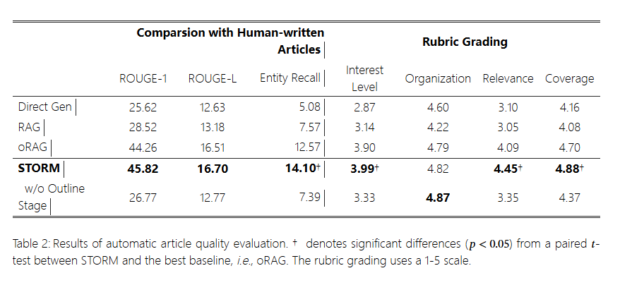 结果表明,与基于大纲检索增强(RAG)的基准相比,STORM系统生成的文章更加有组织性且覆盖知识的范围更广。