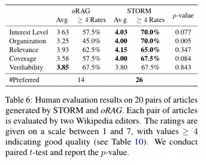 他们与 10 位经验丰富的维基百科编辑合作进行了人类评估,他们从数据集中随机抽取了 20 个主题,并使用 STORM 的方法以及根据自动评估结果确定的 baseline oRAG 对生成的文章进行了评估。每对文章都分配给两名编辑进行审阅,结果如下: