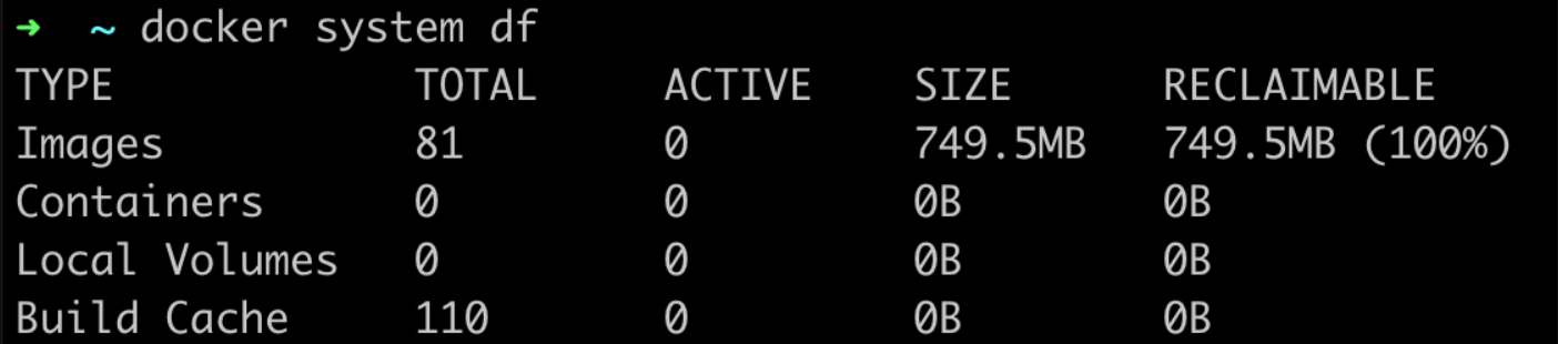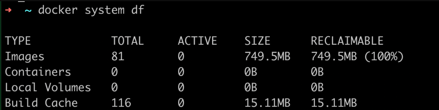 docker占用的存储空间情况,执行docker system df。如图,Build Cache为本地缓存,大小为15.11MB: