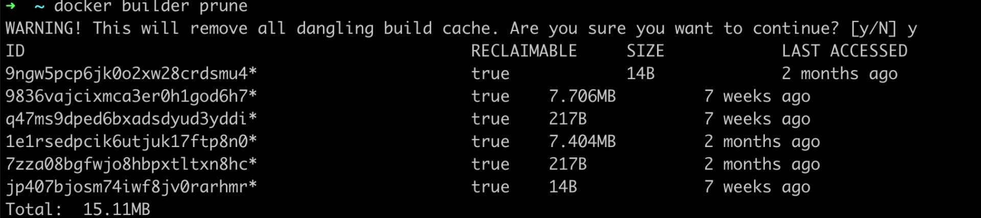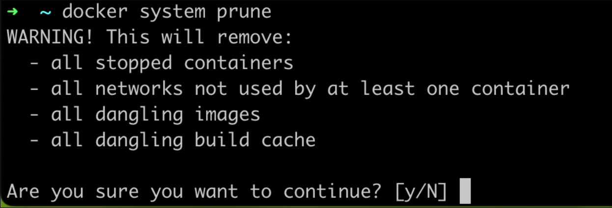 执行命令后,会提示此操作将移除所有悬空镜像缓存,输入y确认: