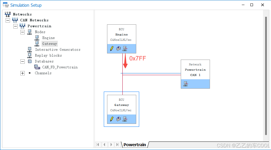 Powertrain网络中可以看到,CANFD总线上有两个节点,Engine节点能够发送0x7FF报文。