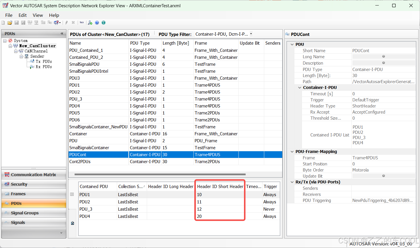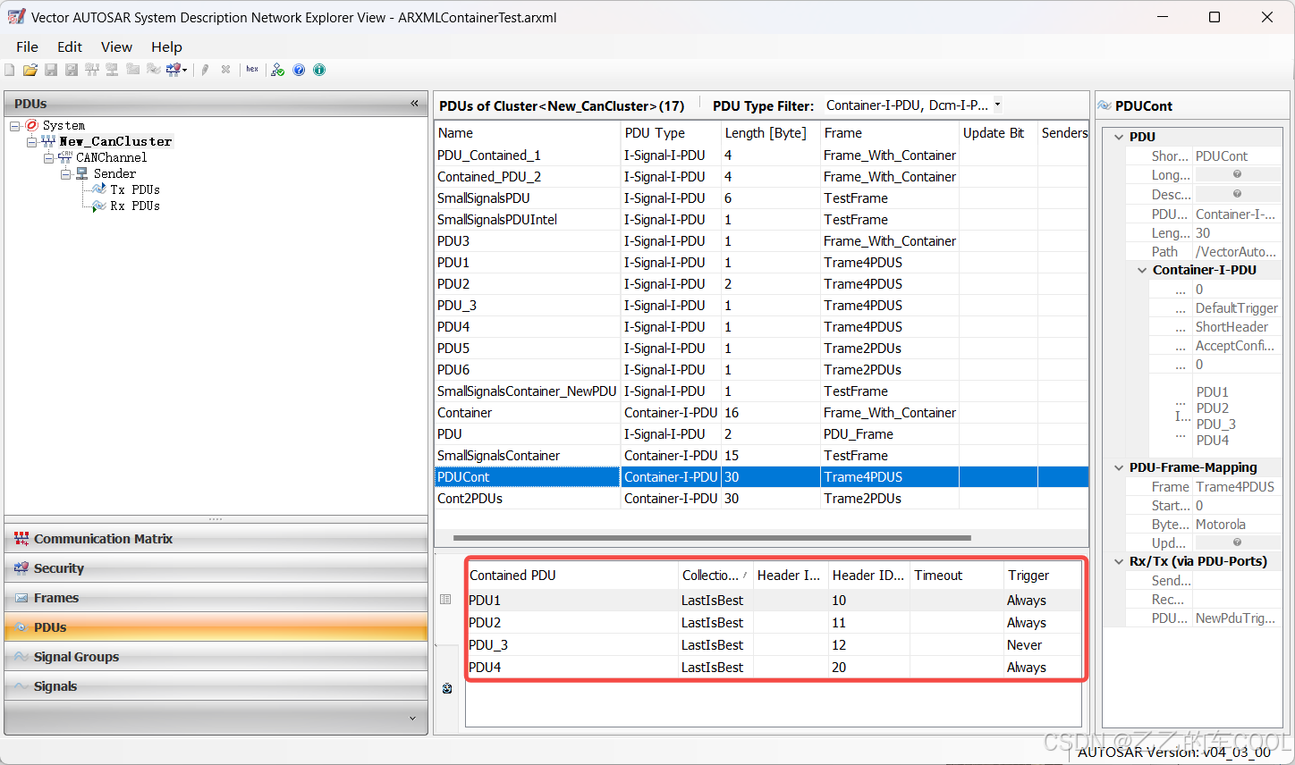 如图所示,PDUCont作为一个Container-PDU,其中包含PDU1、PDU2、PDU_3、PDU4总共四个I-signal-PDU。
