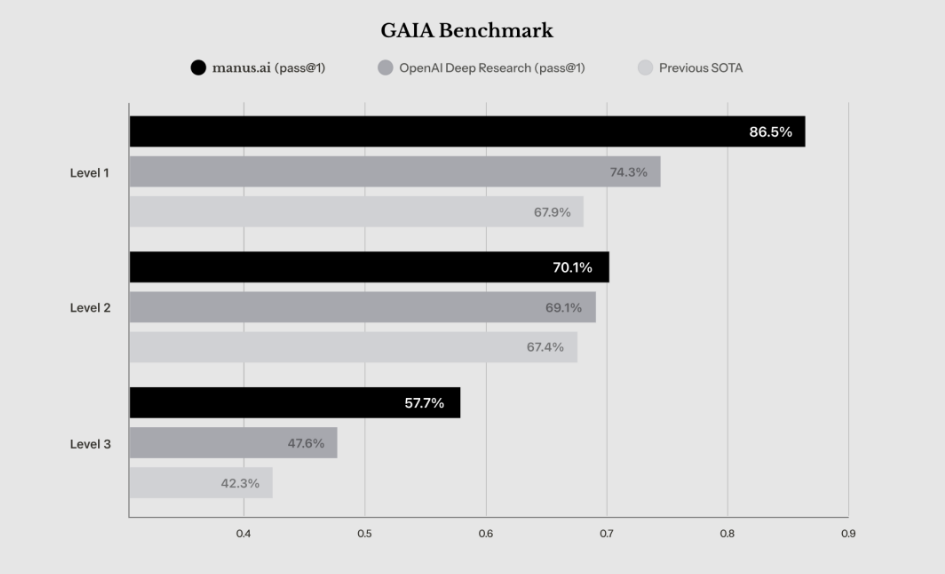 Manus在权威的GAIA基准测试中取得了SOTA(State-of-the-Art)的成绩,性能超越了OpenAI的同类产品。
