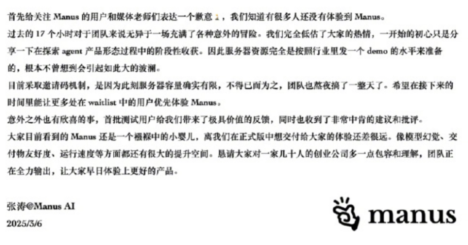 “目前采取邀请码机制,是因为此刻服务器容量确实有限,不得已而为之,团队也熬夜搞了一整天了。希望在接下来的时间里能让更多处在 waitlist 中的用户优先体验 Manus。”