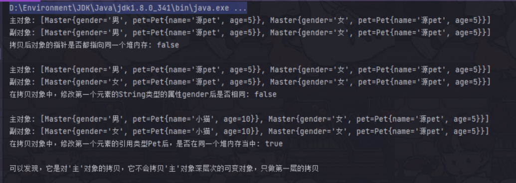 System.out.println("在拷贝对象中,修改第一个元素的引用类型Pet后,是否在同一个堆内存当中: " + (main.get(0).getPet() == vice.get(0).getPet()));
