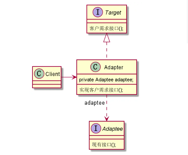 - 适配器类(Adapter):实现目标接口,并通过组合或继承的方式调用适配者类中的方法,从而实现目标接口