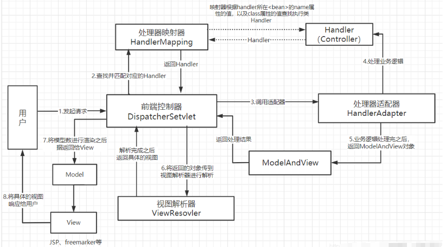 Handler执行业务逻辑,在处理完请求后,会返回一个ModelAndView对象给HandlerAdapter。