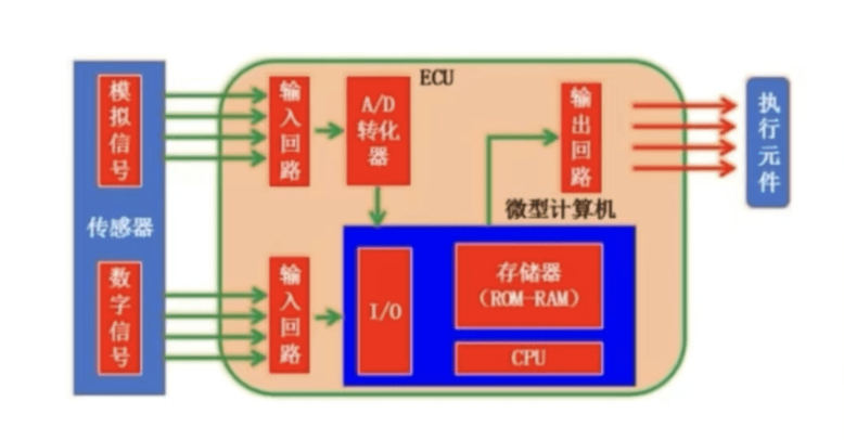 - 其可以对各种输入信号(传感器信号、车载网络信号等)进行加工处理,然后进行信号输出(控制执行器的信号、车载网络信号等)的一个专用嵌入式系统。