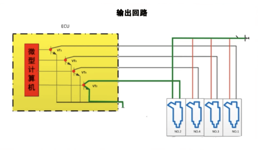 以微机控制的喷油器为例,微机计算机通过控制三极管的基极,从而控制喷油器线路的导通。