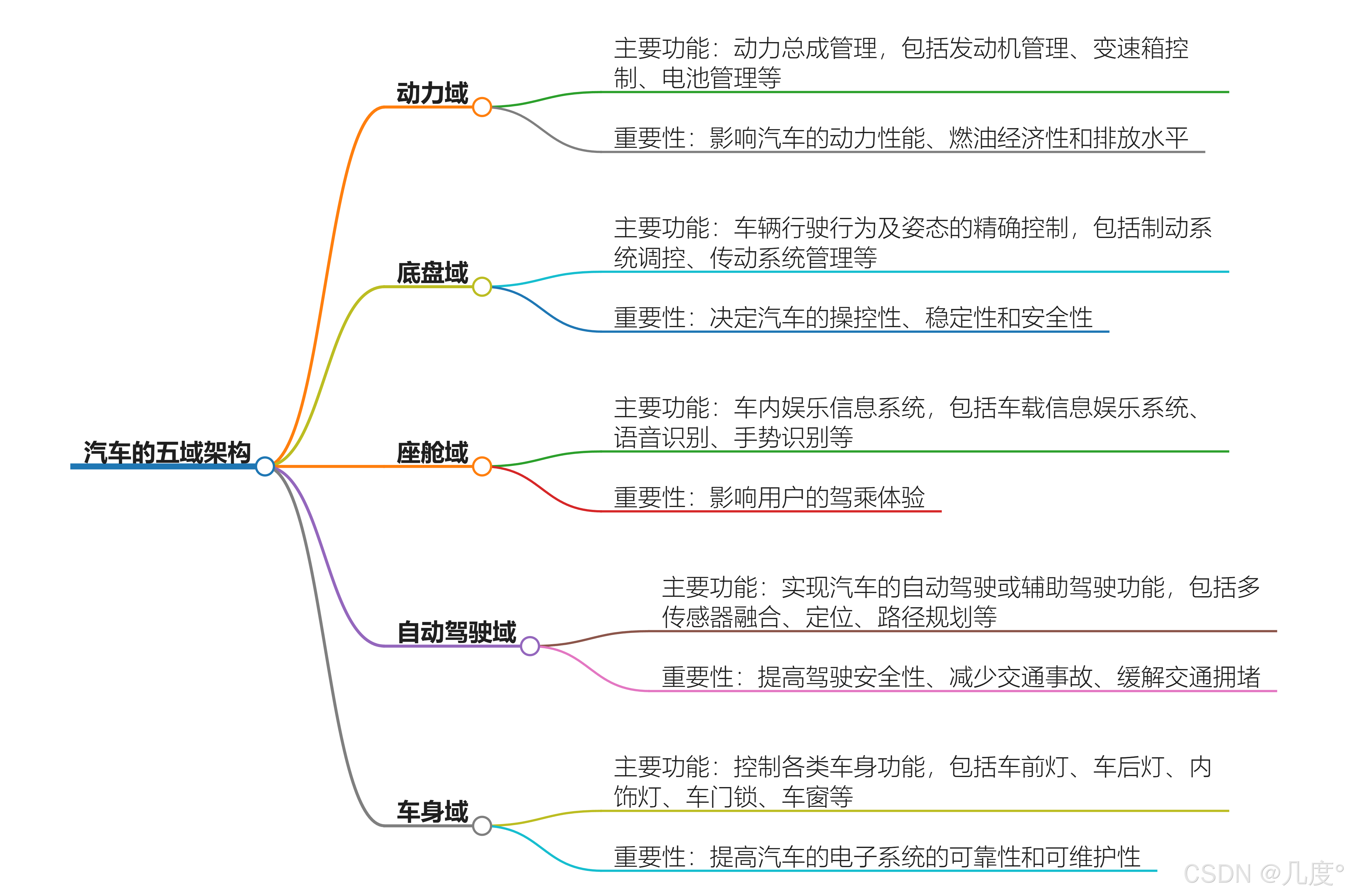 动力域以电驱系统为核心实现能效跃升,底盘域通过线控技术突破机械限制,座舱域聚焦人机交互与信息融合,自动驾驶域推动感知-决策闭环,车身域完成电子系统集中化管理。