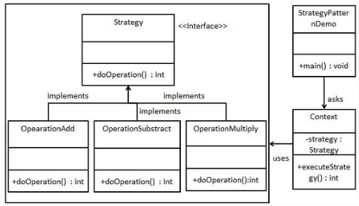 public class StrategyPatternDemo { public static void main(String[] args) { Context context = new Context(new OperationAdd()); System.out.println("10 + 5 = " + context.executeStrategy(10, 5)); context = new Context(new OperationSubtract()); System.out.println("10 - 5 = " + context.executeStrategy(10, 5)); context = new Context(new OperationMultiply()); System.out.println("10 * 5 = " + context.executeStrategy(10, 5)); } }