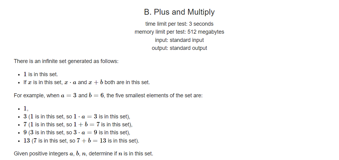 简要翻译:一个无穷集合中的元素由如下规则生成:x=m*a或者x=m+b,其中a,b给定,m为集合元素。在生成初期,集合中包含1。现给定数k,要我们求出k是否在这个无穷集合内。