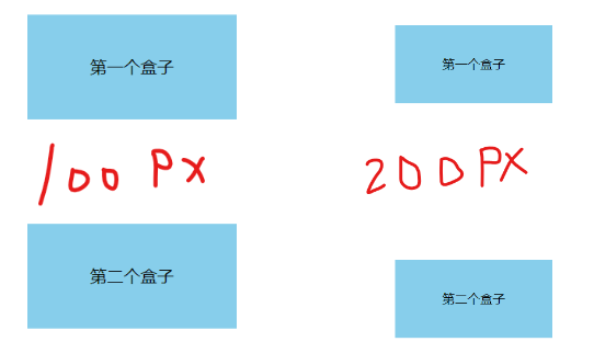 <style> p { width: 200px; height: 100px; background-color: skyblue; line-height: 100px; text-align: center; margin: 100px; } </style> <body> <p>第一个盒子</p> <p>第二个盒子</p> </body>