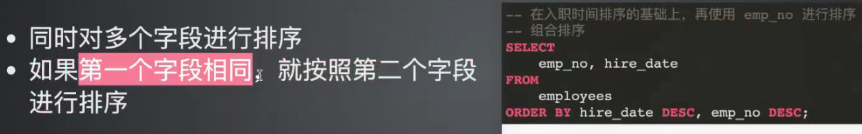 -- 在入职时间排序的基础上,再使用 emp_no 进行降序排序