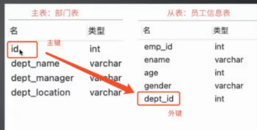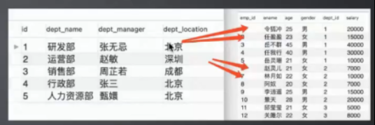 下面的id字段是员工信息表的外键,上面叫dept_id,但和部门表冲突,所以更改为id。如果字段名称相同时想要查找的话,需要表名.列名去分别指定。