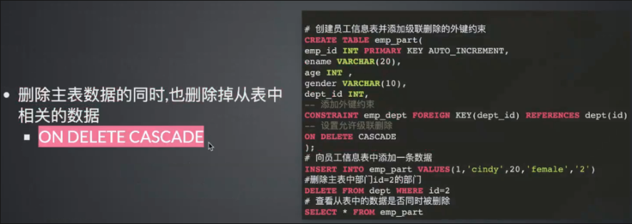 例如:删除主键的部门信息以后,从表中对应部门的员工信息也一并删除