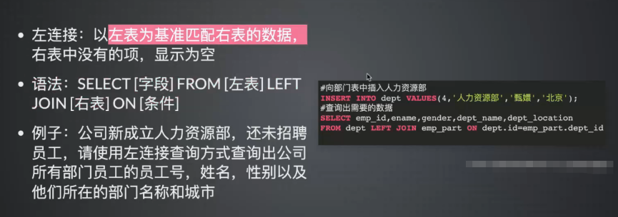 概念:查询多个表中相关联的行,有时候需要包含没有关联的行中数据,即返回查询结果集合中不仅包含符合连接条件的行,还包括左表(左连接)、右表(右连接)中的所有数据行