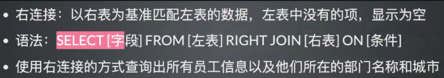 -- 右连接的方式查询所有员工信息以及他们所在部门的名称和城市