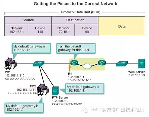 当报文的发送方与接收方位于不同网络,以太网数据链路帧无法直接被发送到目的主机。以太网帧必须先发送给路由器或默认网关。本例中,默认网关是R1,R1的接口IP地址与PC 1属于同一网络,因此PC 1能够直接达到路由器。