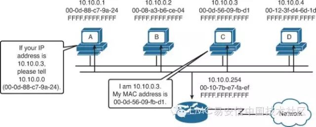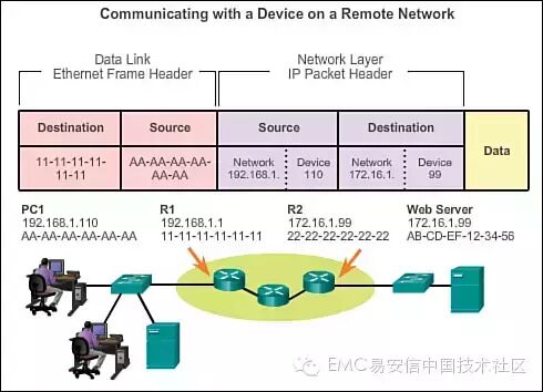 发送设备如何确定路由器的MAC地址?每一个设备通过自己的TCP/IP设置中的默认网关地址得知路由器的IP地址。之后,它通过ARP来得知默认网关的MAC地址,该MAC地址随后添加到帧中。