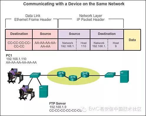 目的MAC地址:当发送设备与接收设备位于同一网络,即为接收设备的数据链路地址。本例中,FTP MAC地址:CC-CC-CC-CC-CC-CC。
