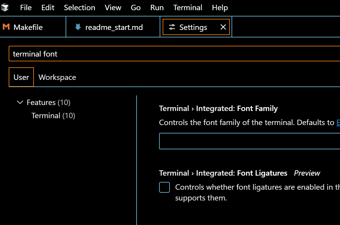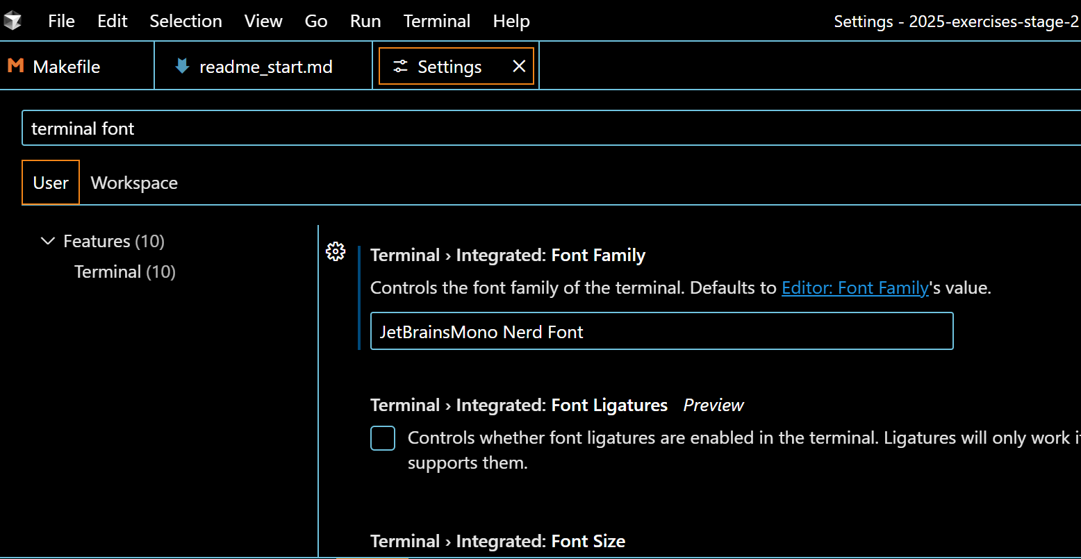 除了在powershell中设置字体,cursor中的终端字体也需要单独设置。网上没找到中文教程,实际上和vscode的配置是相同的。