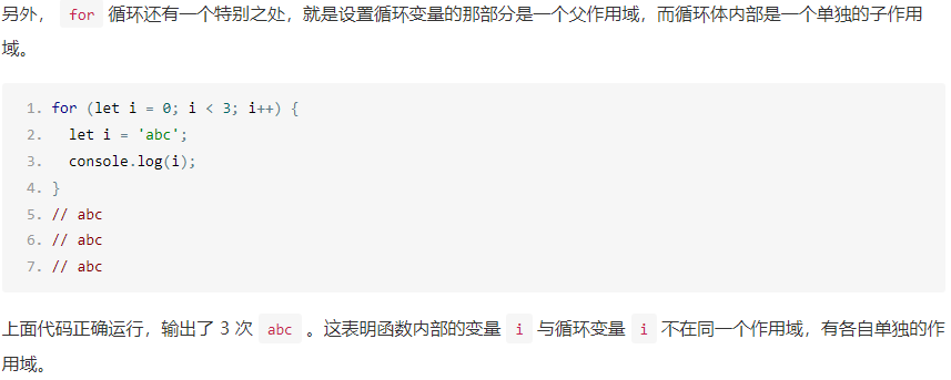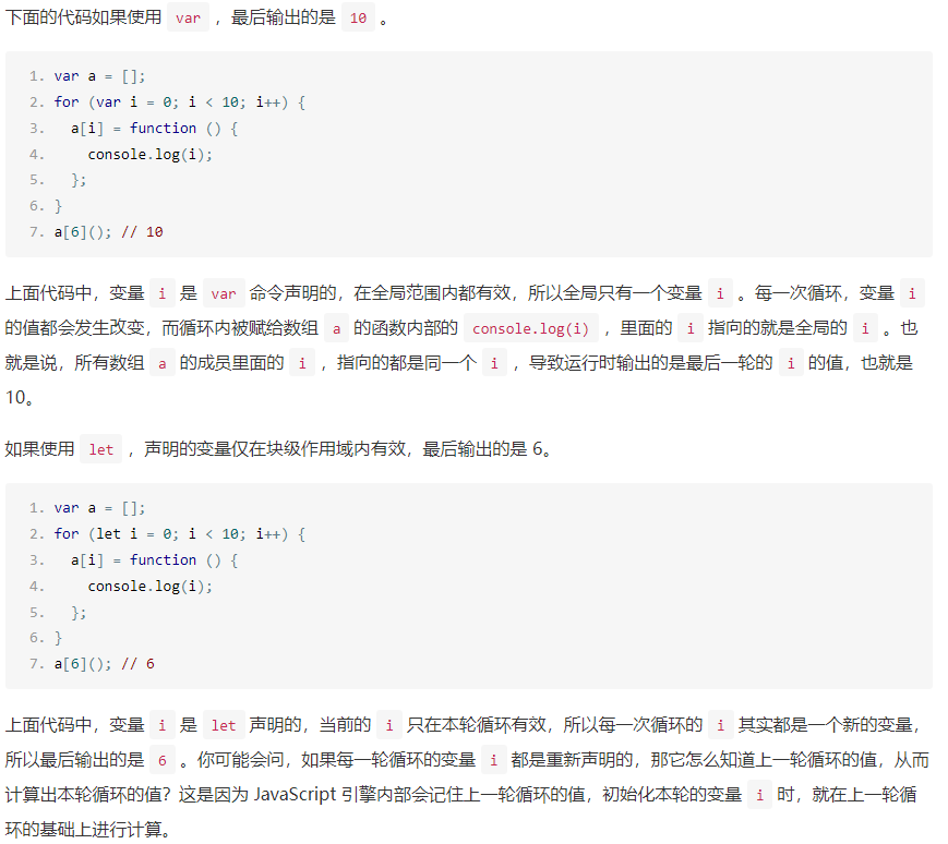 2.for循环中的计数器,很适合使用let声明变量(i只在for循环体内有效,在循环体外引用就会报错)
