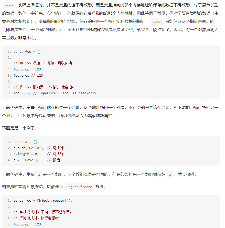上面代码中,常量foo指向一个冻结的对象,所以添加新属性不起作用,严格模式时还会报错。