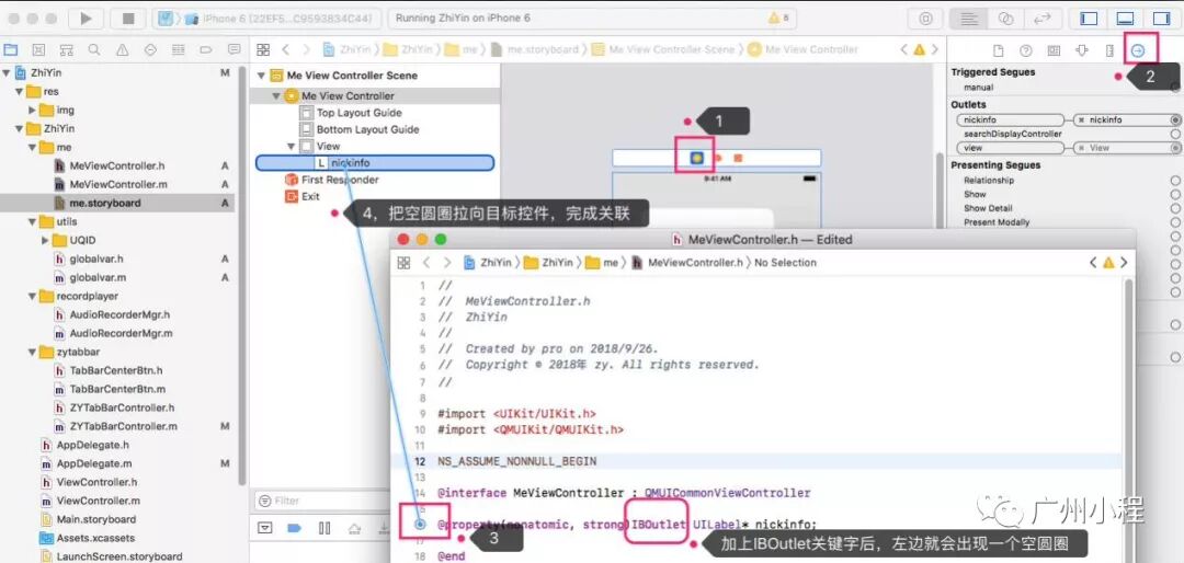这时,这行代码的最左边,会出现一个空的圆圈,可以拉住这个圆圈关联控件,操作如下面的截图所示(需要以new window的方式打开MeViewController.h文件):