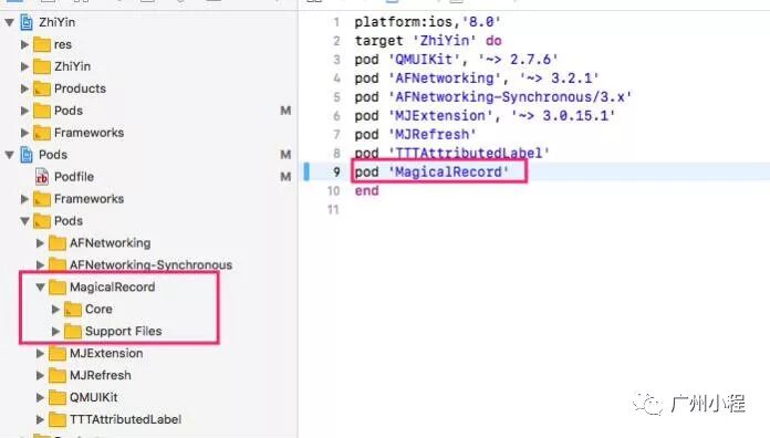 然后在Podfile所在目录,执行命令pod install即可安装。安装完毕,在目标项目,可以看到magicalrecord的影子: