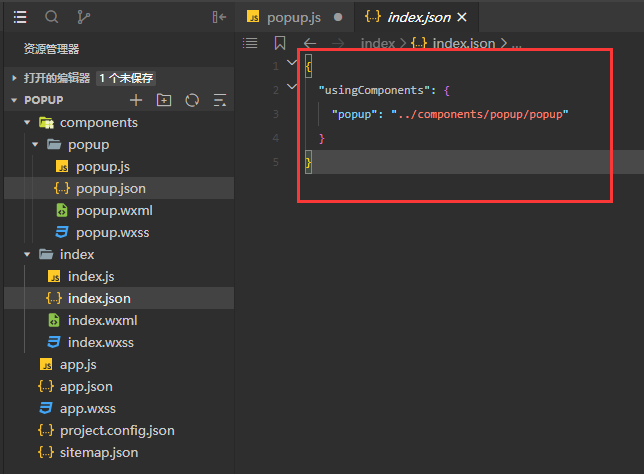 2.在需要引入此组件的json文件中引入