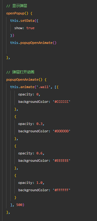 点击 打开表单弹层 按钮,触发 openPopup方法,此方法将show变量改为true,弹层显示,回到popup.wxml,弹层内容最外层设置了代码 style="opcity:0;",此代码的作用是弹层出现时内容还是隐藏的,注意这和真正隐藏有区别,因为此时弹层内容已经被渲染到dom,只是由于opcity:0,它是看不到的。这样设置的目的在于,我在这设置的动画是逐渐浮现。如果不这样设置,会使得点击按钮时弹层先闪一下,即先 完全显示->再从透明慢慢渐变到完成显示,体验效果很差。