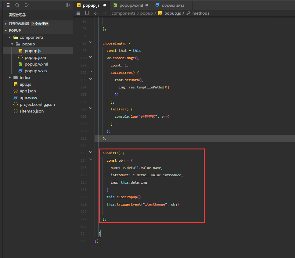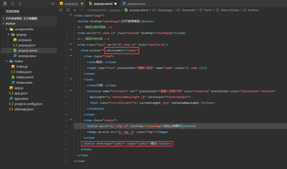回到的popup.wxml,将表单内容放到form里了,当点击提交按钮时,通过函数submit获取到输入的内容