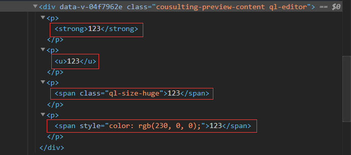 从上面视图可看出,字体加粗,下划线,改变颜色都成功显示,唯有字体大小没有显示,而从代码可看出,只有改变字体大小是引用了富文本编辑器自带的类,其余都是一段html自带标签或者style,问题找到了,肯定是在渲染后的页面中,找不到ql-size-huge这个类,所以123当作正常显示。那么,为什么会出现这个问题呢?原因在于我在引用编辑器的时候,并没有使用全局引用,而只是在此组件中引入,这样导致在其他组件中根本没有ql-size-huge这个类。在vue-cli脚手架中即是没有在main.js中引入此编辑器。所以只要重新全局引用即可。