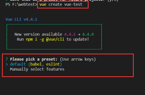 如上图所示,第一个红圈即为创建项目的代码,项目名为vue-test,第二个红圈是选择项目配置,其中第一个是默认选项,第二个是进入手动选择。我选了第一个,然后项目就生成了。