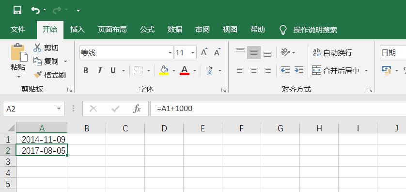 2.在第一个单元格内输入日期,选中第二个单元格,在公式栏输入公式 =A1+1000 ,其实意思就是A1格内的元素叫上一千等于A2格内的元素。回车答案即可显示出来。