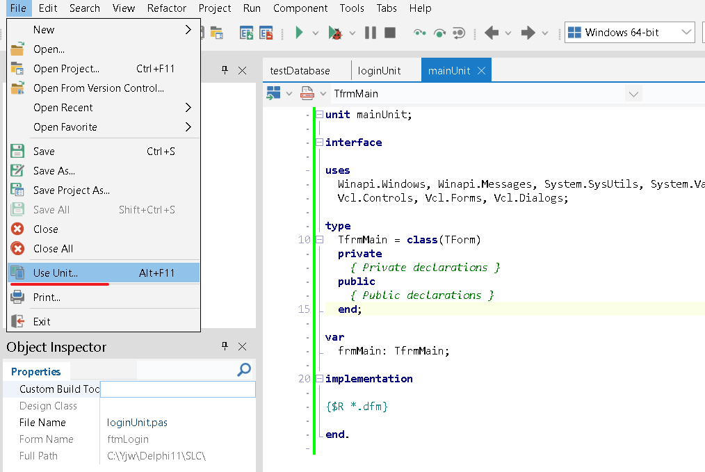 在使用data module的unit中,点击菜单File->Use Unit...,选择要引用的data module