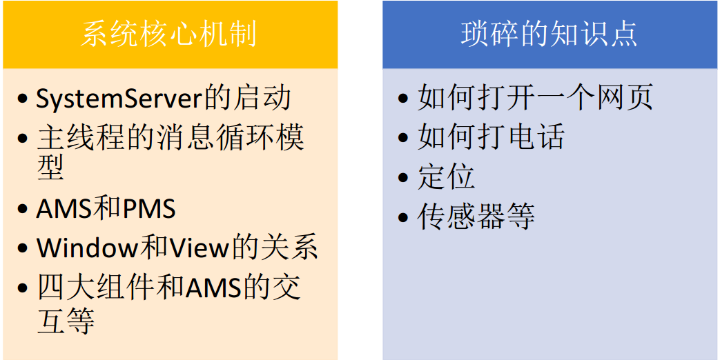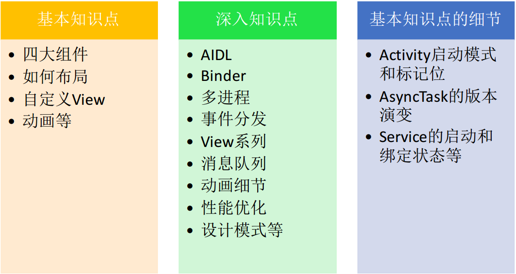 比如四大组件如何使用、如何创建Service、如何进行布局等。这类知识是需要熟练掌握的,并且也没什么难度。