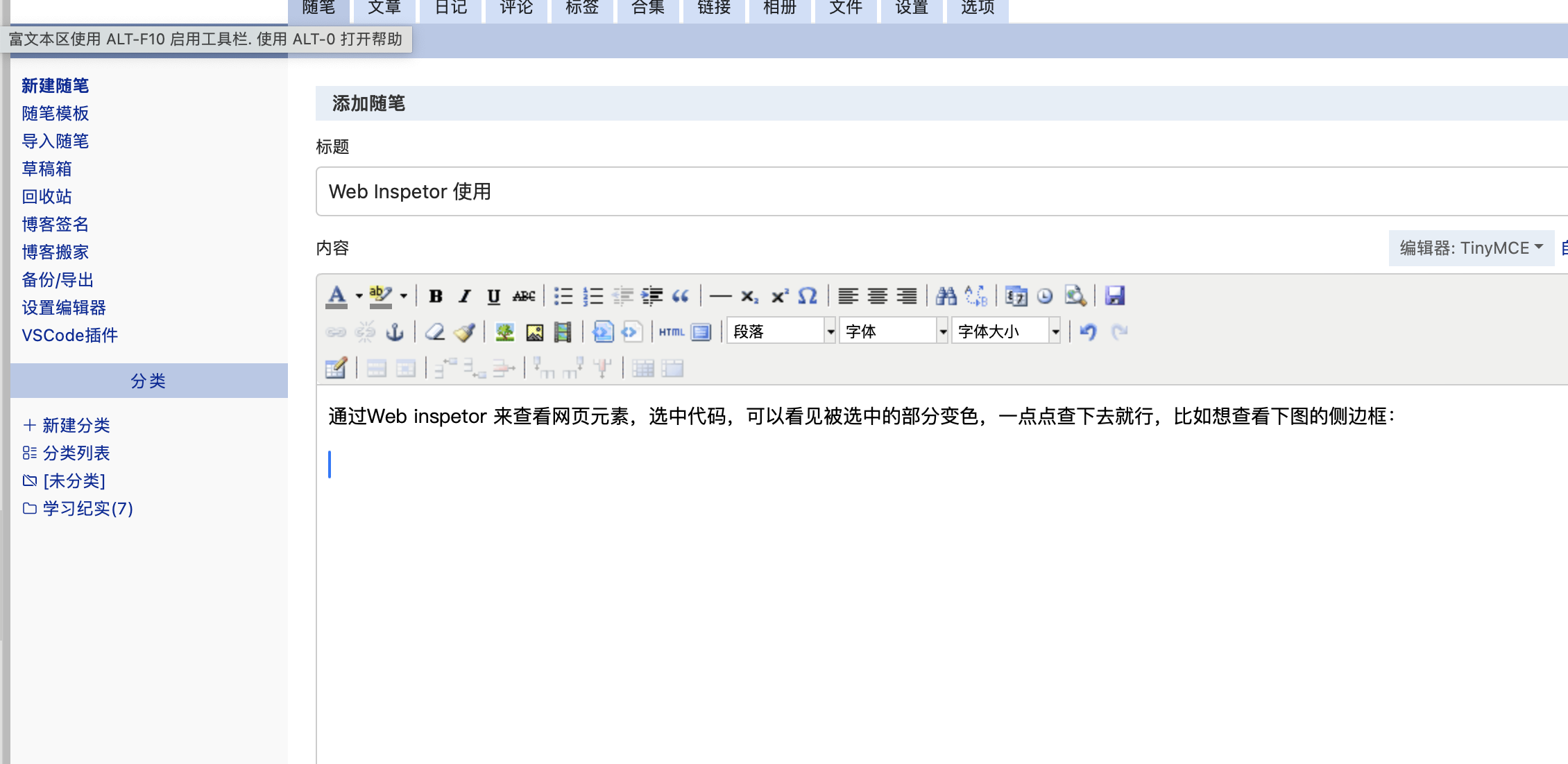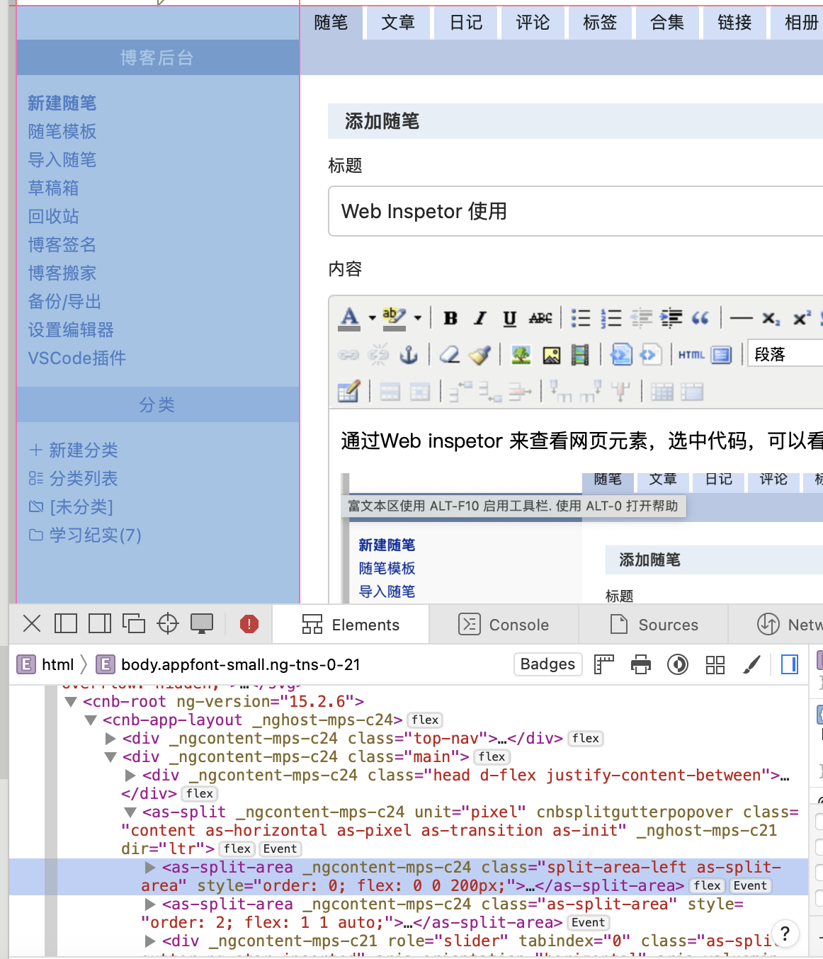 通过Web inspetor 来查看网页元素,选中代码,可以看见被选中的部分变色,一点点查下去就行,比如想查看下图的侧边框: