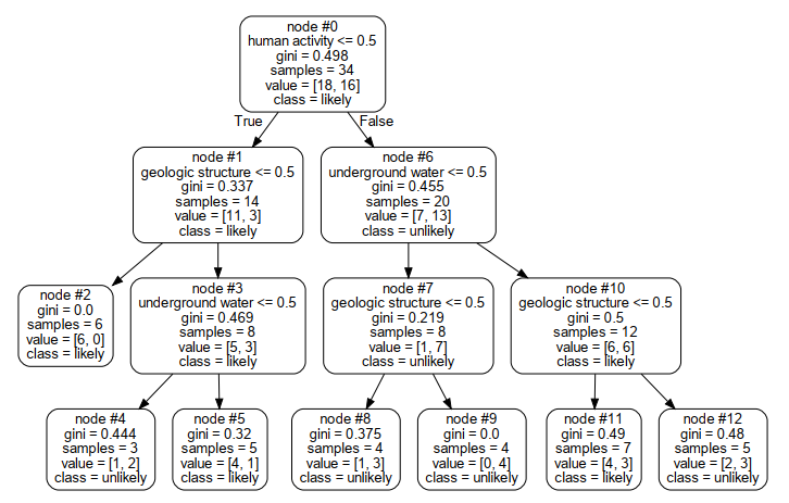 import numpy as np import pandas as pd import pydotplus from sklearn.tree import DecisionTreeClassifier from sklearn.tree import export_graphviz from sklearn.preprocessing import LabelEncoder from sklearn.metrics import classification_report df = pd.read_excel("susceptibility.xls",index_col=0) df.head() geologic = LabelEncoder() df.iloc[:,0]=geologic.fit_transform(df.iloc[:,0]) print(np.array(df.iloc[:,0])) geologic_label = geologic.classes_ print("geologic_label: ",geologic_label) human = LabelEncoder() df.iloc[:,1]=human.fit_transform(df.iloc[:,1]) print(np.array(df.iloc[:,1])) human_label = human.classes_ print("human_label: ",human_label) water = LabelEncoder() df.iloc[:,2]=water.fit_transform(df.iloc[:,2]) print(np.array(df.iloc[:,2])) water_label = water.classes_ print("water_label: ",water_label) susceptibility = LabelEncoder() df.iloc[:,3]=susceptibility.fit_transform(df.iloc[:,3]) print(np.array(df.iloc[:,3])) susceptibility_label = susceptibility.classes_ print("susceptibility_label: ",susceptibility_label) decision_tree = DecisionTreeClassifier().fit(df.iloc[:,:3],df.iloc[:,3]) decision_tree_predict = decision_tree.predict(df.iloc[:,:3]) print(classification_report(df.iloc[:,3],decision_tree_predict)) dot_data = export_graphviz(decision_tree,feature_names = df.columns[:3],class_names =susceptibility_label, rounded = True,node_ids=True) graph_data = pydotplus.graph_from_dot_data(dot_data)