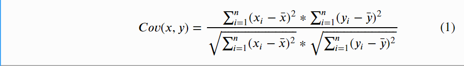 $$Cov(x,y)=\frac{\sum_{i=1}^{n}({x_i-\bar{x})^2}*\sum_{i=1}^{n}({y_i-\bar{y})^2}}{\sqrt{\sum_{i=1}^{n}({x_i-\bar{x})^2}}*\sqrt{\sum_{i=1}^{n}({y_i-\bar{y})^2}}}$$