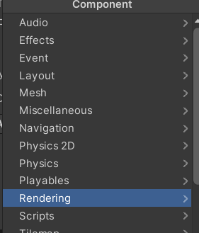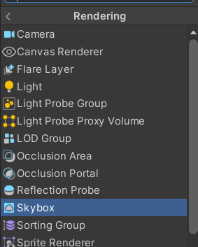 Camera游戏对象中Inspector窗口使用Add Component添加游戏组件,选择Rendering的Skybox