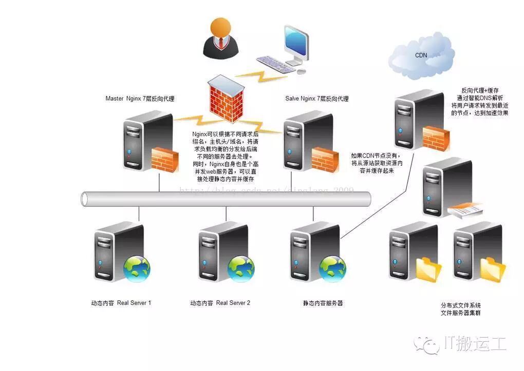 还有一招用的比较多的,那就是动静分离。可以需要开发人员配合(把静态资源放独立站点下),也可以不需要开发人员配合(利用7层反向代理来处理,根据后缀名等信息来判断资源类型)。有了单独的静态文件服务器之后,存储也是个问题,也需要扩展。多台服务器的文件怎么保持一致,买不起共享存储怎么办?分布式文件系统也派上用场了。