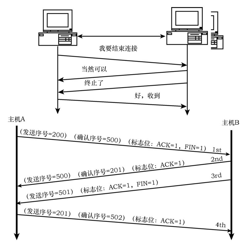 第一次挥手:当客户A要断开TCP连接时,发送一个包,其中标志位fin=1,ACK=1,发送序号SEQ=x,确认序号ACK=y,上图中x=200,y=500。Client进入FIN_WAIT_1状态。 第二次挥手:客户B知道A要断开后,发送一个确认包,其中标志位ACK=1发送序号,SEQ=y确认序号ACK=x+1=201,Server进入CLOSE_WAIT状态。 第三次挥手:客户B也断开TCP连接,此时发送一个包,其中,标志位fin=1,发送序号SEQ=y+1=501,Server进入LAST_ACK状态。 第四次挥手:客户A收到B的断开请求后,Client进入TIME_WAIT状态,接着发送一个确认包,标志位ACK=1,发送序号SEQ=x+1=201,确认序号ACK=y+2=502;Server进入CLOSED状态。 由于TCP连接是全双工的,因此,每个方向都必须要单独进行关闭,这一原则是当一方完成数据发送任务后,发送一个FIN来终止这一方向的连接,收到一个FIN只是意味着这一方向上没有数据流动了,即不会再收到数据了,但是在这个TCP连接上仍然能够发送数据,直到这一方向也发送了FIN。