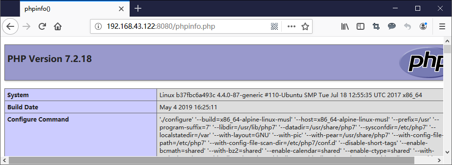在浏览器中访问http://192.168.43.122:8080/phpinfo.php