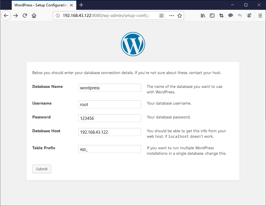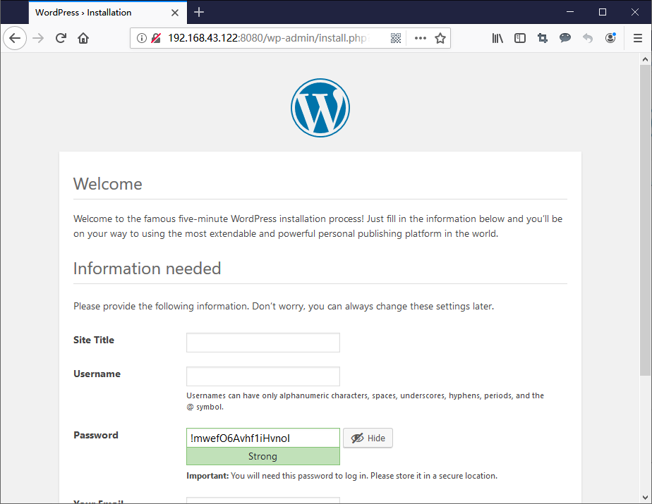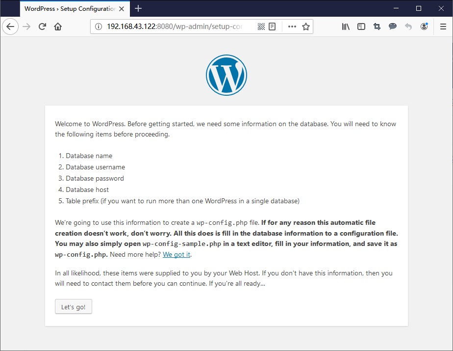 在浏览器中访问http://192.168.43.122:8080,可以看到wordpres页面