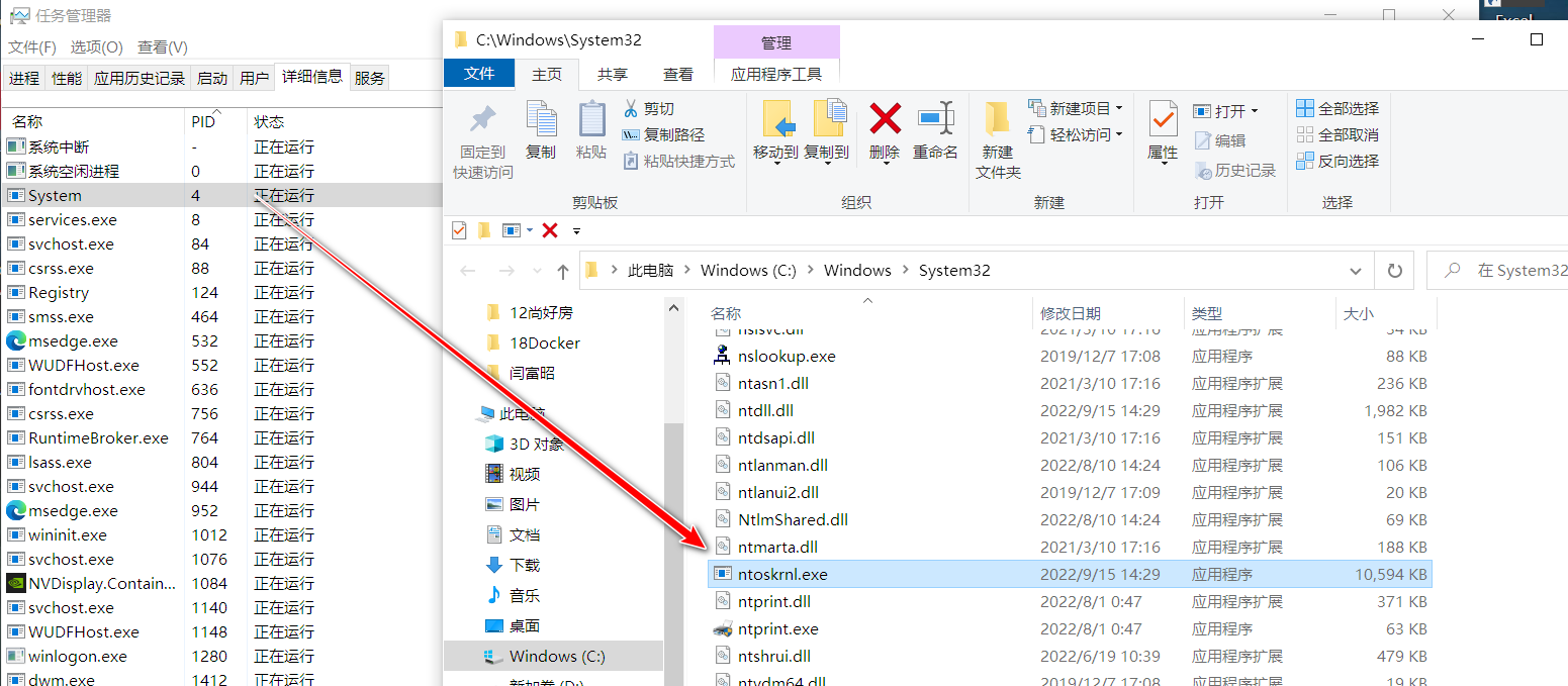 进入任务管理器,找到PID为4的进程名称,右键打开文件所在位置,