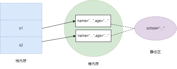 s1和s2两个引用变量存放在栈中(stack),s1和s2指向的对象存放在堆中(heap),school变量存放在方法区(静态区)中(method area)。