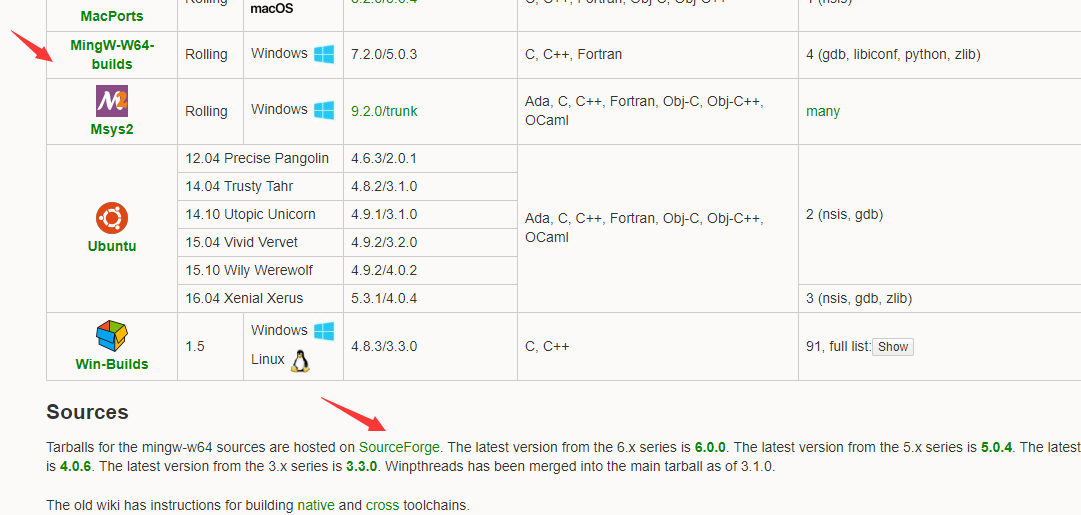 Pre-built toolchains and packages指的是预编译好的包,选择好系统然后下载一个官方下载器就是了。我这边因为笨比的移动宽带,下载时会报错cannot download repository.txt,仓库目录都下不了了那下个毛线啊?那就只能离线下载全部的源文件了。在下面的Sources里找到他们源码的下载网站Sourceforge,略过上面的源码目录,拉到最下面,有编译好的压缩文件: