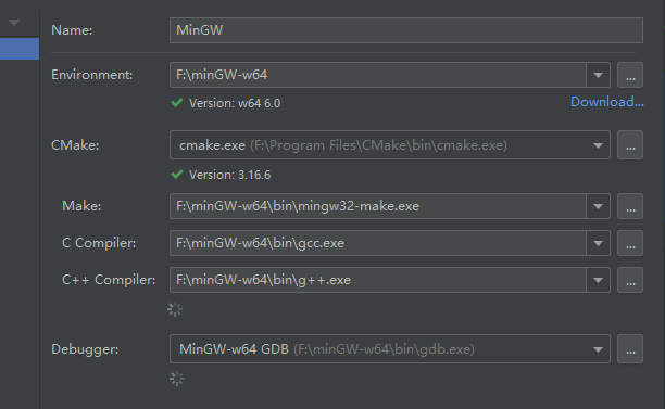 - 工具配置。初次打开clion它会报错下面这几个玩意找不到,要你自己填,那填就是了。其实环境、编译器、gdb都没有问题,错在cmake它默认用的是bundle自带捆绑的玩意,那用不了也是可以理解。自己去网上下好cmake并安装(推荐下.msi的,有安装向导还帮你设环境变量),然后再设置就不会报错了,像我这样:
